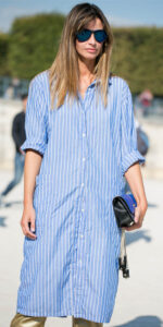 Este look con camisola larga hasta las rodillas es ideal para que pruebes si tienes más de 40 años porque se trata de un look super cómodo, con onda y muy bello. La camisola es rayada con botones y si quieres verte super cool puedes llevar sus mangas hasta los codos. Por debajo combina genial con un pantalón ajustado que ayudará a destacar la prenda superior.