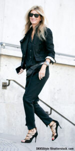El monocromo es infalible, nunca puede salir mal y siempre nos hará ver atractivas, sobrias y muy bonitas. Este look se trata de uno bien cómodo que te dejará óptima para cualquier situación. Se compone de una camisa, una campera y un pantalón ajustado en color negro muy cancheros. Y le agrega un lindo toque con unas sandalias negras de taco fino y tiras cruzadas hasta el tobillo que te harán verte hermosa si tienes más de 40 años.