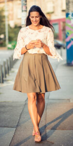 Las faldas campanas son super atractivas e ideales para climas cálidos y templados que te permiten tener las piernas al descubierto y disfrutar de la temperatura. En este caso se combina de maravilla con una blusa de escote semi-redondo y unas mangas 3/4 abiertas. Se trata de un look casual-formal para mujeres de más de 40 años que podrás lucir para ir al trabajo, a una reunión o a una salida con amigos.