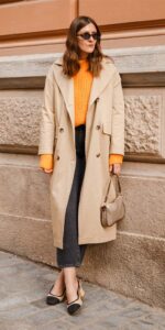 Este look está conformado por una polera larga de cuello recto y mangas bien largas que por encima lleva un saco largo hasta las pantorrillas de dos botones. Es un look elegante, sobrio y muy atractivo que te quedará genial si tienes más de 40 años. Además aporta un toque relajado con el pantalón de jean o mezclilla y unos zapatos bajos de punta redonda. ¿Qué te parece?