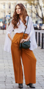 Esta opción es ideal si tienes más de 40 años porque combina genial la formalidad con la simpatía. Se trata de una camisa de mangas cortas bien entallada al cuerpo y de un pantalón de tiro medio también ajustado al cuerpo que hace juego con una cartera del mismo color. Además agrega unos sandalias altas super bonitas. ¿Te animas a probar este look?