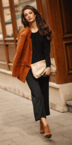 Este look es bellísimo por su simplicidad y su gran comodidad. Se trata de una blusa larga de escote redondo color negro y un pantalón hasta los tobillos de corte recto también negro. Este monocromo básico aporta gran elegancia y formalidad que es combinada a la perfección con un saco medio-corto y unos botines cortos en color marrón-naranja que le dan un toque de relax al look y que si tienes más de 40 años debes probar.