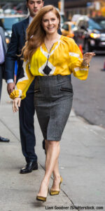 Si tienes más de 40 años y quieres un look elegante, simpático, cómodo y muy atractivo te recomendamos este: se trata de una blusa larga con escote en V -en este caso en color amarillo saturado con detalles en blanco y sus puños con volados- y una falda ajustada bien entallada al cuerpo de tiro alto que te permitirá lucir tus piernas a la perfección. Con el bonito agregado de unos stilettos que le darán un toque sofisticad al look.