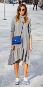 Los vestidos son grandísimos aliados para los buenos looks y en este caso es uno ideal de manga larga, cuello alto y con la terminación inferior en picos y con un ancho volado. Se trata de un look informal-casual pues utiliza unas zapatillas deportivas y cartera. Es un look moderno y dinámico que te hará verte super cool si tienes más de 40 años.