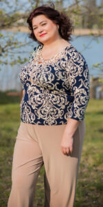 Las blusas son de lo mejor para tener un outfit divino que nos haga ver super bien y que nos haga sentirnos cómodas y cuente un poco acerca de nuestra personalidad. Esta blusa estampada posee un fondo azul con dibujos en blanco por encima con cuello redondo y mangas 3/4 queda idea con un pantalón de tiro medio y ancho. Es un buen look para disfrutar si tienes 50 años o más y para variar con diferentes tipos de colores y diseños.