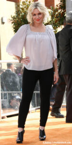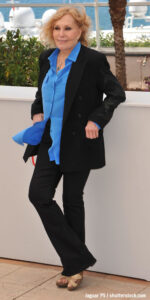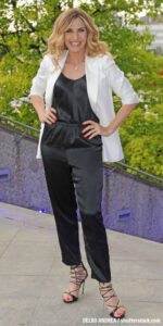 Este outfit resulta un poco más formal y sobrio al llevar un traje completo de pantalón y saco largo en color negro y queda genial para mujeres de más de 50 años. Pero resulta muy versátil porque le agrega un toque informal y más casual al cortar su estilo con una camisa turquesa en tono bien saturado con el cuello abierto y su terminación holgada, por fuera del pantalón. Es un look canchero, cómodo y muy bello que puedes variar en todos los colores que lo desees. Y en los pies lleva unas sandalias de tacones altos que también le aportan elegancia al look.