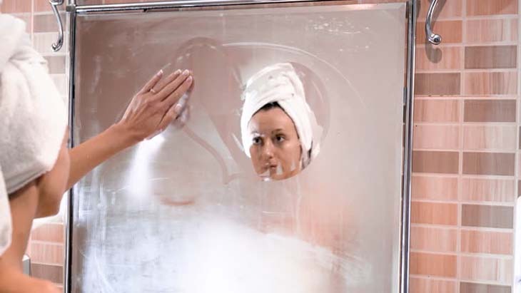 Suele tardar un poco en hacerlo desaparecer, y cuando por fin podemos ver nuestro reflejo en el espejo, éste está cubierto de niebla y humedad.