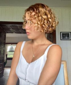 Este corte de cabello corto con rizos es un corte super práctico para aquellas mujeres que quieren que el cabello les quede cómodo rodeando su cabeza. Este corte está «moldeado» pues los rizos están cortos y juntos acompañando la forma de la cabeza y llegando hacia abajo de las orejas de manera sutil. Da un aire fino y sofisticado. ¡Anímate!