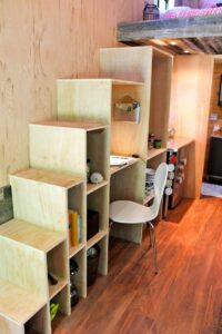 Una vez finalizada la base siguió con las paredes y hasta culminar con el techo. Cada espacio fue muy bien diseñado y aprovechado. Como veremos en la foto a continuación, las escaleras en cada peldaño tienen un espacio amplio para guarda.