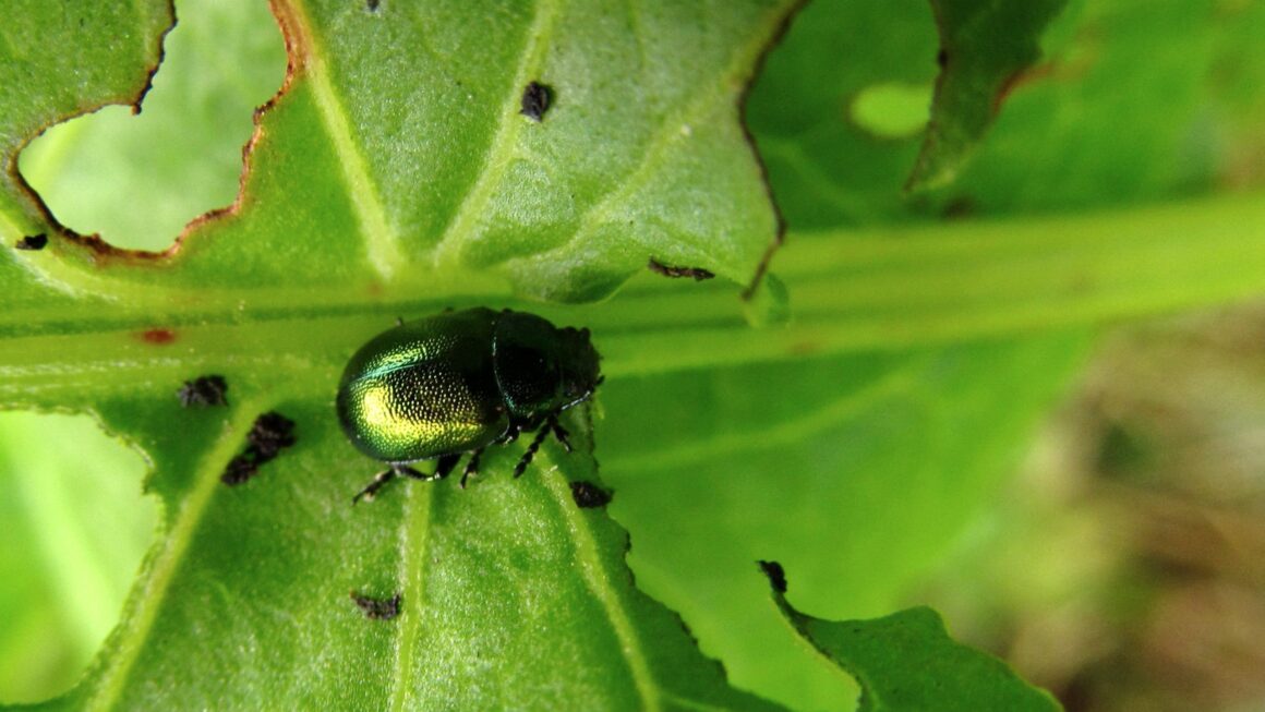 Llamado así porque salta como una pulga, el escarabajo salta sobre las hojas haciendo pequeños agujeros que pueden debilitar la planta .