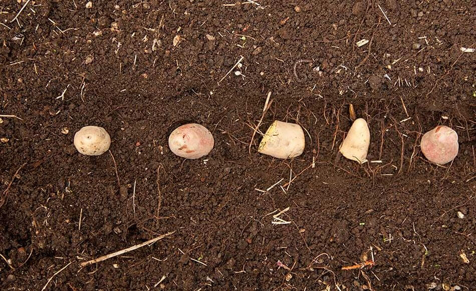 Platzieren Sie die Pflanzkartoffeln auf der Oberfläche des vorbereiteten Bodens im vorgegebenen Reihenabstand und bedecken Sie sie mit 8 bis 10 cm losem, kernlosem Stroh. Wenn die Stängel wachsen, skalieren Sie mehr Stroh um sie herum, so dass schließlich eine Schicht von 30 cm oder mehr entsteht.