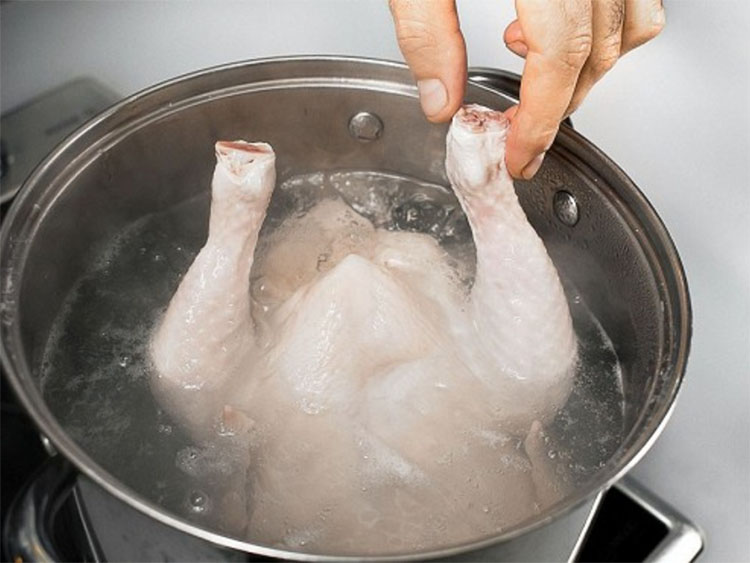 Das Hähnchen in Wasser legen und bei schwacher Hitze zum Kochen bringen. Sobald das Wasser kocht, lassen Sie das Hähnchen noch etwa 10 Minuten bei schwacher Hitze köcheln.