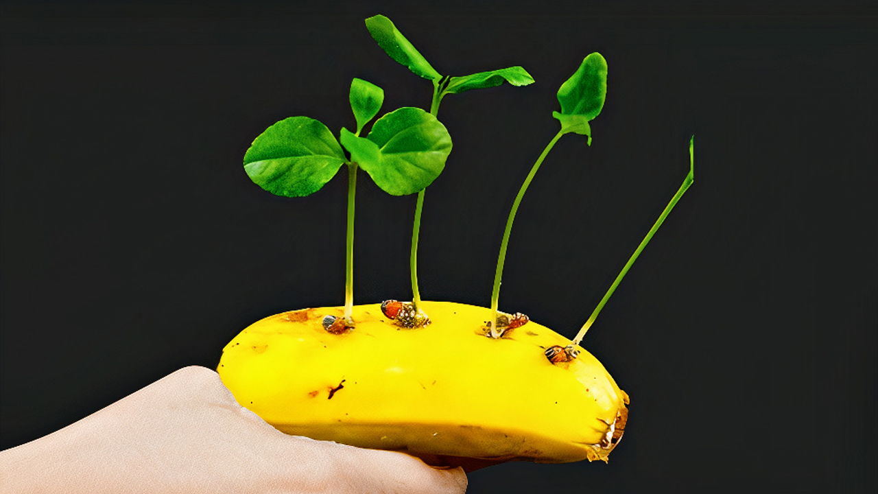 Nehmen Sie die Teile der Banane, die Sie vor fünf Tagen hineingelegt haben, langsam heraus und beobachten Sie, wie die Samen auf natürliche Weise aus der Frucht herausgesprungen sind. Mit der Zeit wird Ihnen klar, dass Ihre Pflanze weiter wächst und mehr Platz benötigt.