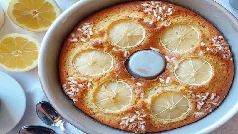 Die schaumige, klumpenfreie Mischung in die Form gießen. Die Zitronenscheiben hinzufügen und im statischen Ofen bei 175 ° ca. 40-45 Minuten backen.
