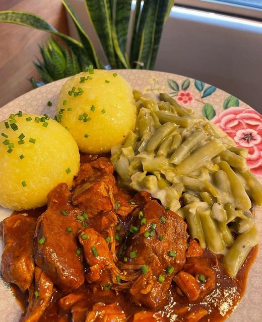 Das war’s! Jetzt können Sie Ihr leckeres Gulasch mit Klößen und grünen Bohnen genießen. Guten Appetit!