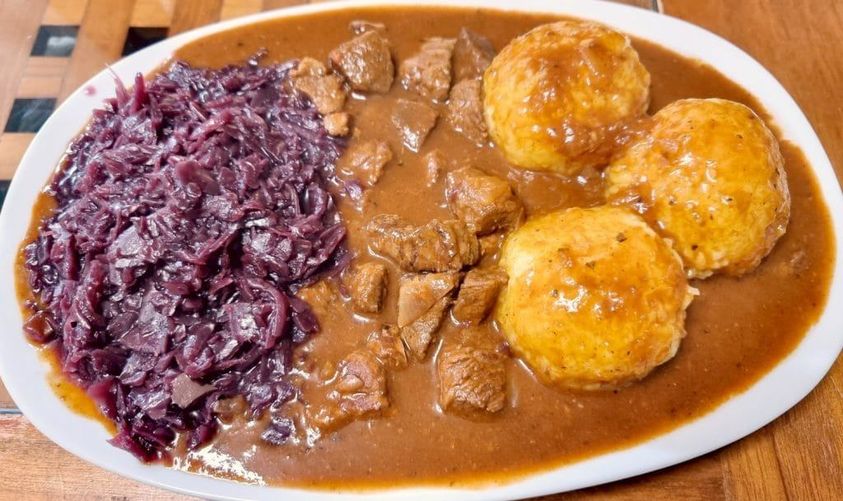 Ca. eine halbe Stunde vor Ende der Schmorzeit des Gulaschs die Klöße in leicht siedendem Salzwasser garen und das Rotkraut zubereiten.