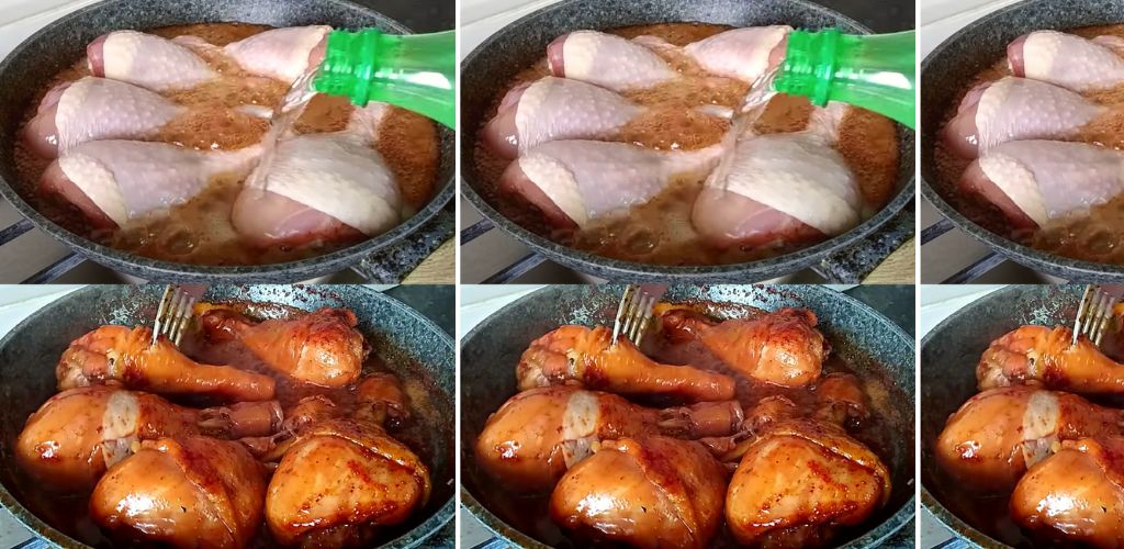 - Hühnchen hinzufügen und mit Getränken aufgießen.