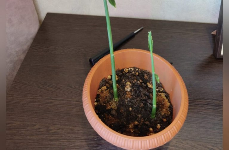 Eine Woche später erschien der erste grüne Spross! Er ist endlich zum Leben erwacht! Bald wuchs der zweite und der erste erreichte bereits eine Länge von 10 cm. Mit jedem Tag wurden die Sprossen stärker und höher. Die ersten Blätter entwickelten sich schnell und nach 12 Tagen erreichte der erste Spross eine Höhe von 65 cm und die Blattbreite betrug etwa 3 cm.