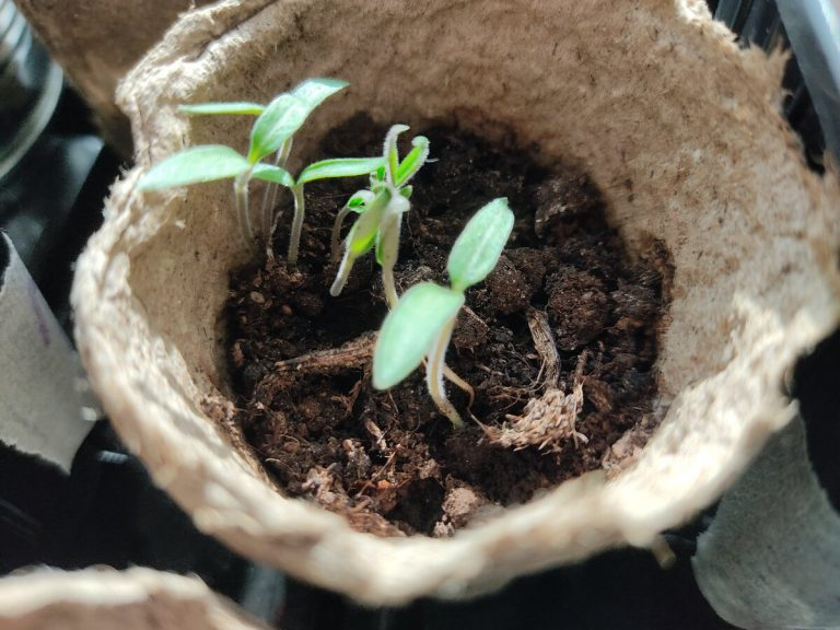 In einem Topf mit Kirschtomaten hörten einige Sprossen auf zu wachsen, so dass nur noch vier gesunde übrig blieben.