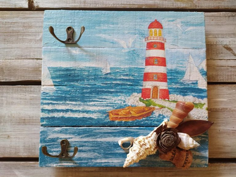 Nach einem Ausflug ans Meer habe ich die Muscheln, die ich mitgebracht hatte, einer guten Verwendung zugeführt, indem ich Bretter aus einer alten Schachtel und Decoupage wiederverwendete, was zur Schaffung eines Schlüsselhalters am Meer für unser Zuhause führte.