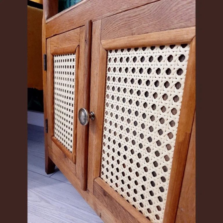 Über den Türen habe ich Rattangeflecht angebracht und die Tischplatte mit Furnier überzogen, wobei an den Seiten die ursprünglichen Eichenlatten übrig blieben.