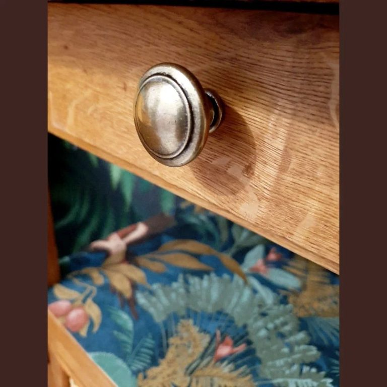 Um die Rückwand des Schranks zu dekorieren, habe ich in meinen Mülleimern helle Tapeten mit Blumendruck gefunden.