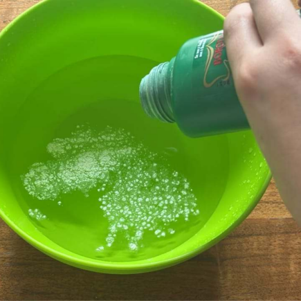 Das warme Wasser beschleunigt den Auflösungsprozess des Talkumpuders im Behälter. Mischen Sie nun einfach die Lösung, bis sich das Talkumpuder vollständig im Wasser auflöst.