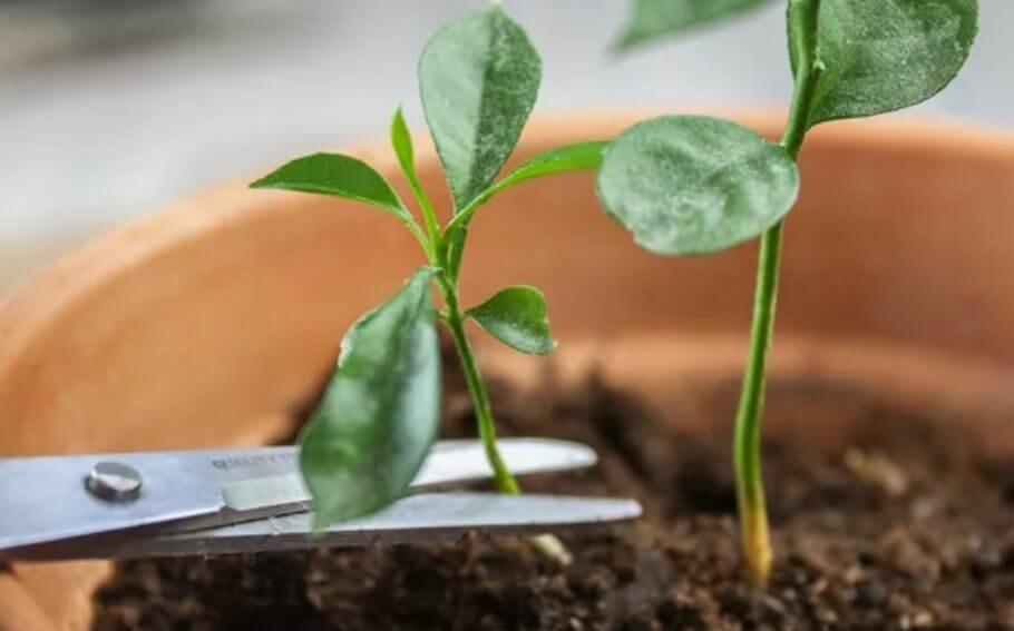 Orangenbäume produzieren zwei verschiedene Arten von Sämlingstrieben: genetische Triebe und vegetative Triebe. Die vegetativen Triebe weisen die gleichen Eigenschaften wie der Mutterbaum auf, sodass sie letztendlich hochwertige Früchte hervorbringen. Genetische Triebe weisen aufgrund der Fremdbestäubung genetische Variationen auf, so dass sie möglicherweise nicht die gleiche Fruchtqualität produzieren und entfernt werden sollten. Jeder Orangensamen kann drei Keime produzieren: einen genetischen und zwei vegetative. Die vegetativen Triebe sind kräftig und höher als der schwächere genetische Trieb. Schneiden Sie den genetischen Spross an der Basis mit einer kleinen Schere ab und entsorgen Sie ihn, damit die vegetativen Sprosse ohne Konkurrenz um Nährstoffe wachsen können.
