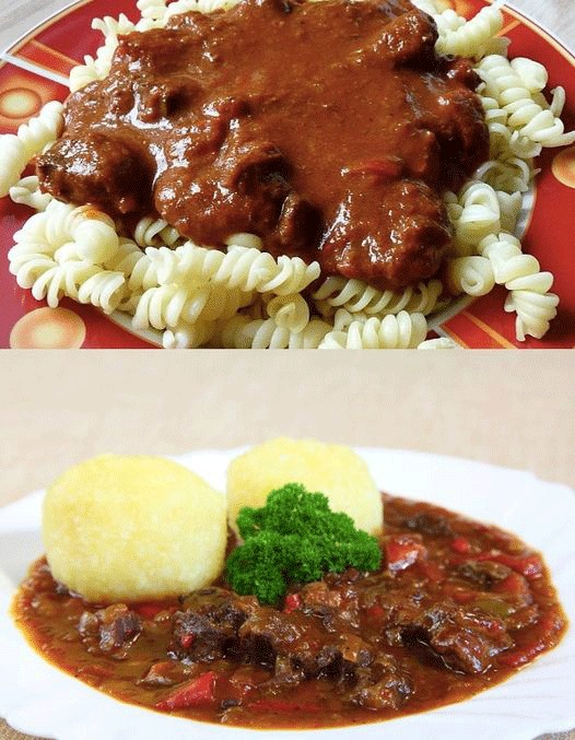 Dann erst das Fleisch dazugeben, eventuell mit klarer Brühe etwas angießen, nicht zu viel, das Fleisch sollte noch zu sehen sein. Jetzt mit Salz und Pfeffer würzen. Das Gulasch auf kleiner Hitze 2 – 3 Stunden langsam köcheln lassen.
