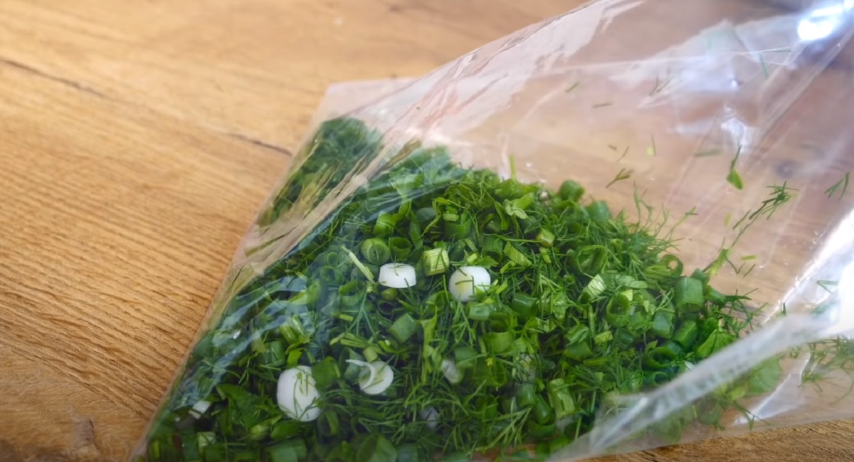 1. Dill, Petersilie und Frühlingszwiebeln waschen und trocknen. Anschließend mit einem Messer zerkleinern und in eine tiefe Schüssel geben. Mischen Sie sie.
