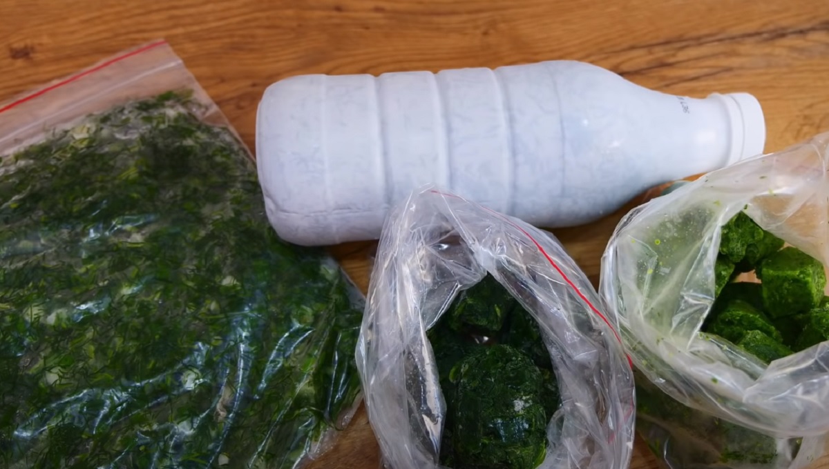 3.Legen Sie Flaschen und Tüten mit Grünzeug in den Gefrierschrank.