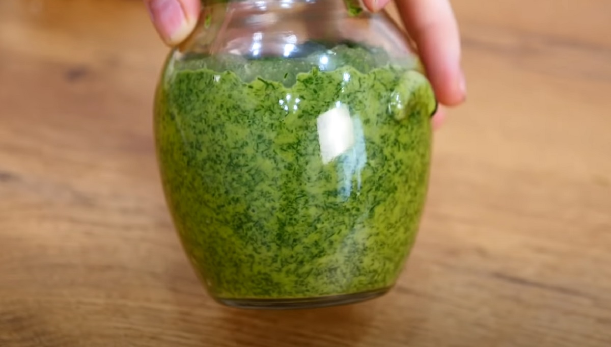 3.Transferați pasta de mărar într-un borcan sterilizat. Acoperiți-l cu un capac sterilizat.