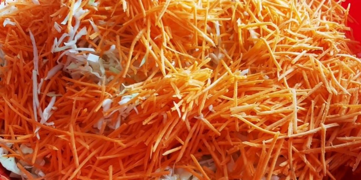 2. Reiben Sie Ihre Karotten durch die Reibe, die die Produkte in dünne und lange Streifen verwandelt. Mit dem Kohl in die Schüssel geben.