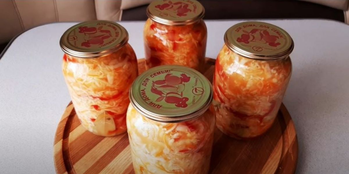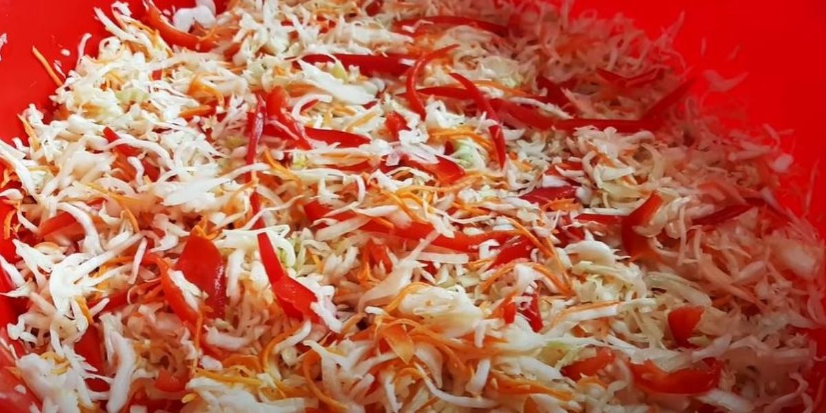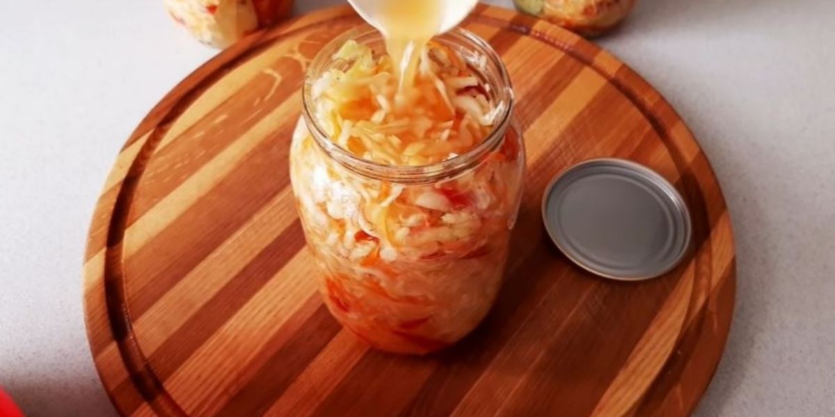 8. Bereiten Sie die Gläser vor: 6-8 schwarze Pfefferkörner und ein Lorbeerblatt in den Boden geben und kompakt mit Krautsalat füllen. Danach noch ein paar Esslöffel der Marinade, die sich in der Salatschüssel angesammelt hat, gerade so viel, dass die Gläser mit einer Spitze gefüllt sind. Mit Deckeln abdecken und 30 Minuten bei 200°C sterilisieren.