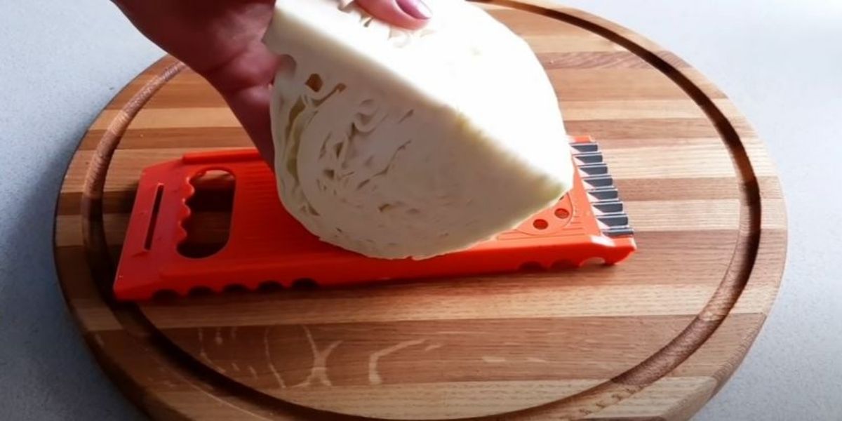 1. Den Kohl vierteln. Wir empfehlen Ihnen, den Stachel nicht sofort zu entfernen, da die Blätter sonst nichts mehr zum Festhalten haben und es für Sie schwieriger wird, sie zu zerkleinern. Zerkleinern Sie den Kohl mit Hilfe einer speziellen Reibe für Kohl oder einfach mit einem Messer.