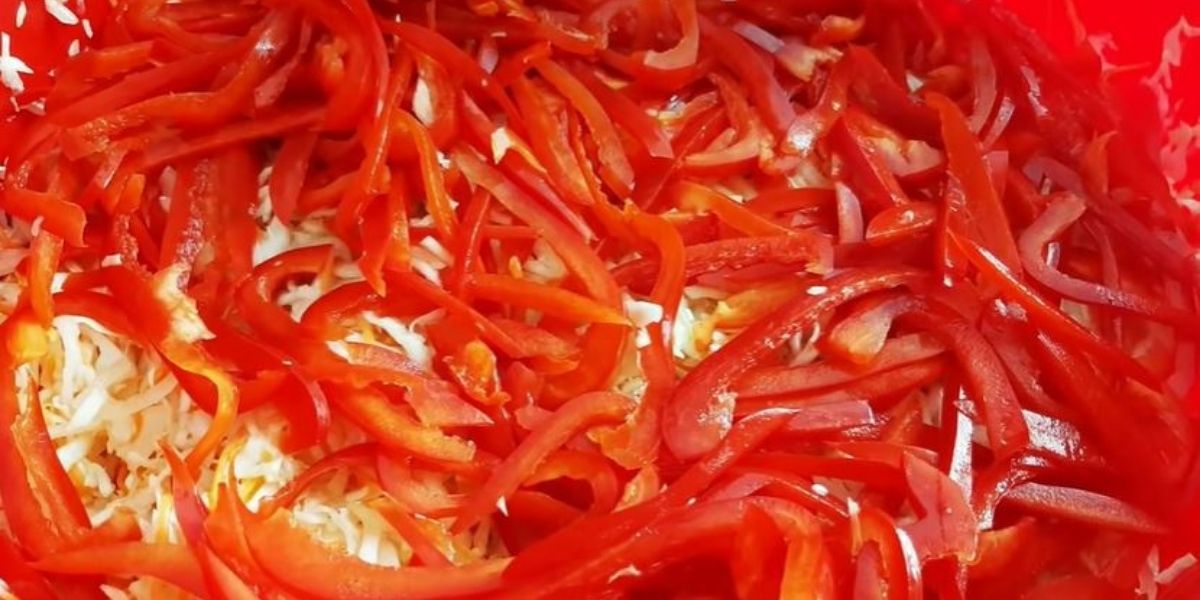 3. Paprikaschoten in lange, dünne Streifen schneiden. Gib sie in die Salatschüssel.