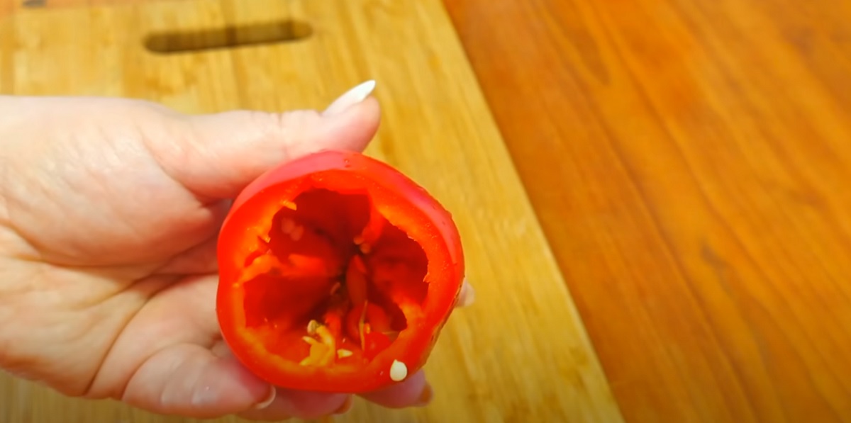 1.Schneiden Sie die “Kappen” der Paprika ab. Säubere sie von Kernen und Rippen.