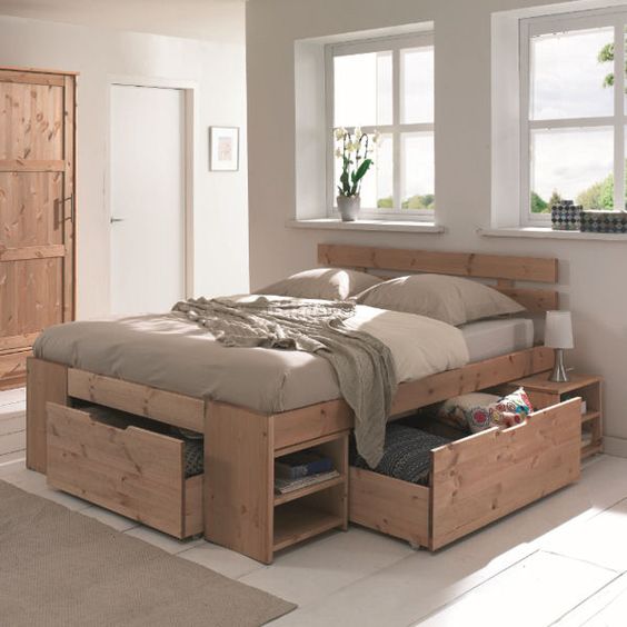 Um zusätzlichen Platz im Schlafzimmer zu schaffen, können Sie ein Bett mit Schubladen verwenden. Durch die Verwendung eines solchen Bettes werden die anderen Möbel nicht mehr benötigt und der Raum wirkt größer und geräumiger.
