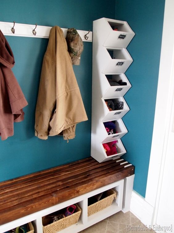In Ihrem Flur können Sie zum Beispiel ein an der Wand montiertes Schuhregal horizontal platzieren, sodass Sie auch Ihre Kleidung daneben platzieren können.