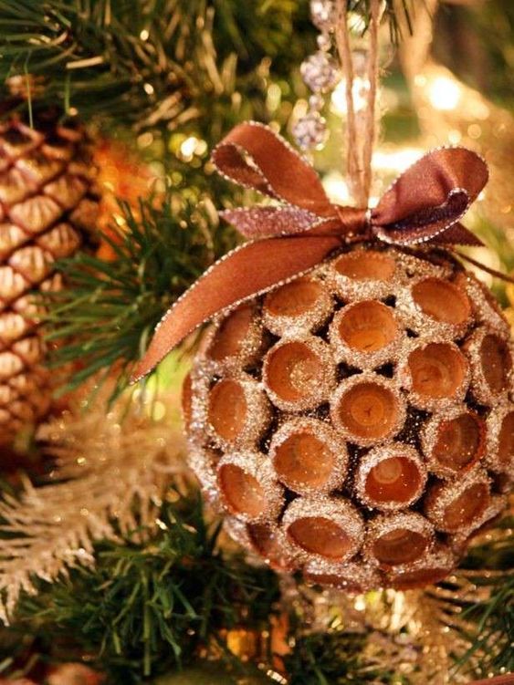 Seltsam, aber wahr, Sie können auch Eichelschalen wiederverwenden, um eine rustikale, aber ausgesprochen originelle Kugel zu erhalten.