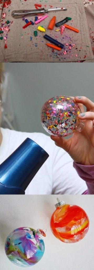 Es mag Ihnen seltsam vorkommen, aber auch mit Wachsfarben können Sie originelle und super dekorative Kugeln kreieren. Alles, was Sie tun müssen, ist, ein paar alte Farben und einen Fön zu verwenden: Das Ergebnis wird wirklich wow sein!