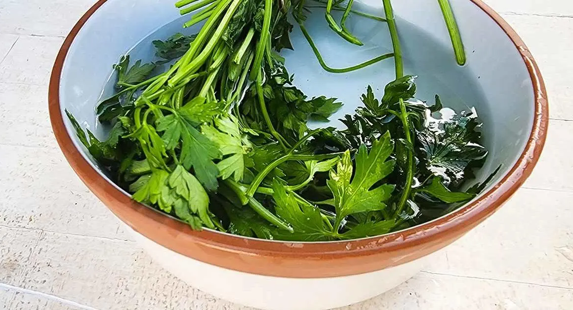 1. Möchten Sie, dass Ihre Petersilie in Ihrem Wasserkrug frisch bleibt? Sie müssen nur die Unterseite der Stängel um 12 mm abschneiden, damit sie mehr Wasser aufnehmen können, und dann die gebräunten Blätter entfernen.