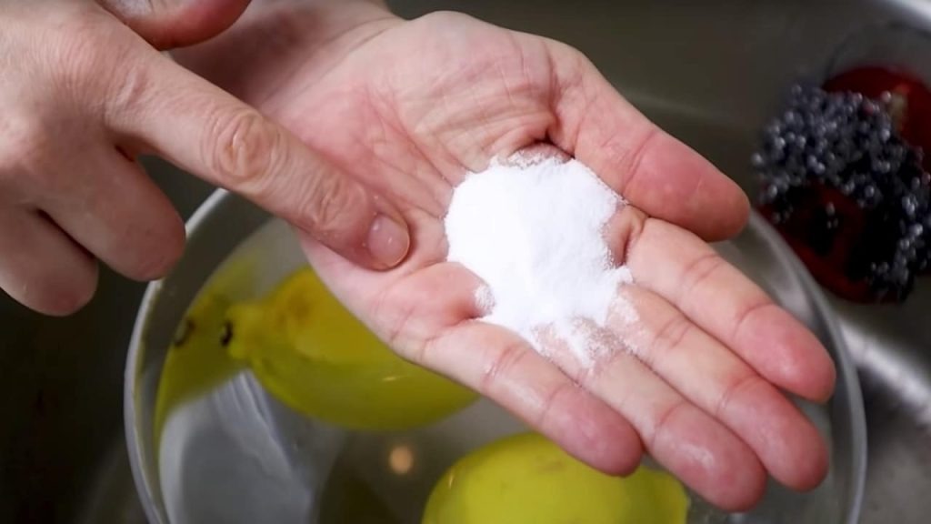 Das feine Salz beseitigt mit seiner abrasiven Wirkung alle Spuren von Verunreinigungen , die sich auf der Rinde festgesetzt haben. Dies muss für beide Zitronen durchgeführt werden, dann unter fließendem Wasser abgespült und dann mit einer Handvoll Backpulver eingerieben werden.