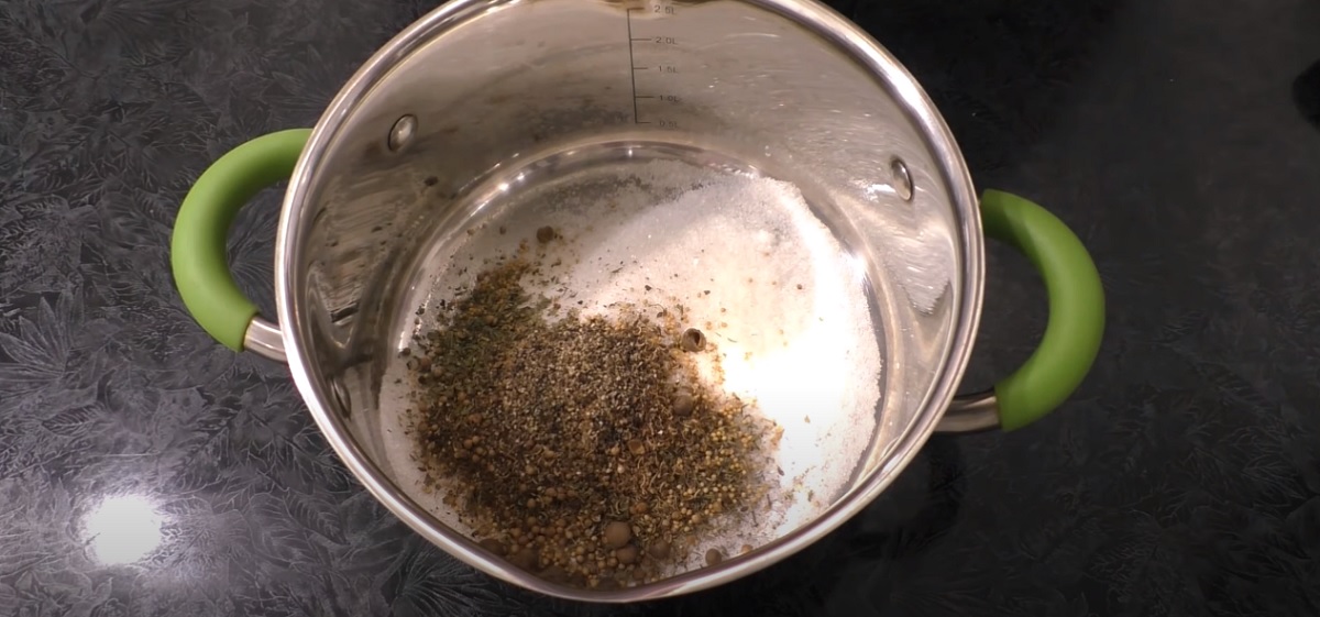 2.Bereiten Sie die Marinade zu: Nicht jodiertes Salz, Zucker, Thymian, Estragon, Kreuzkümmel und Dillsamen, gemahlenen schwarzen Pfeffer, Senfbeeren, Koriander und Piment in einen Topf geben.