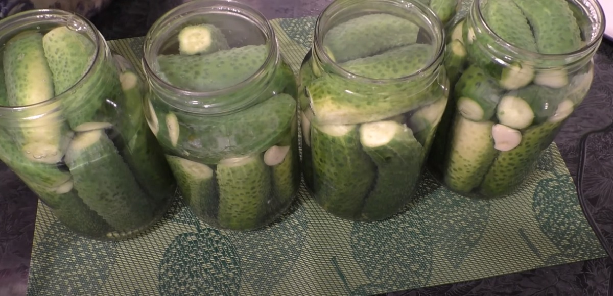 6.Îndepărtați capetele castraveților și așezați-i compact în borcanele sterilizate: inițial în poziție verticală, iar apoi și în poziție orizontală (în funcție de dimensiunea lor). Adăugați cățeii de usturoi între ei.