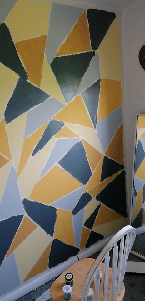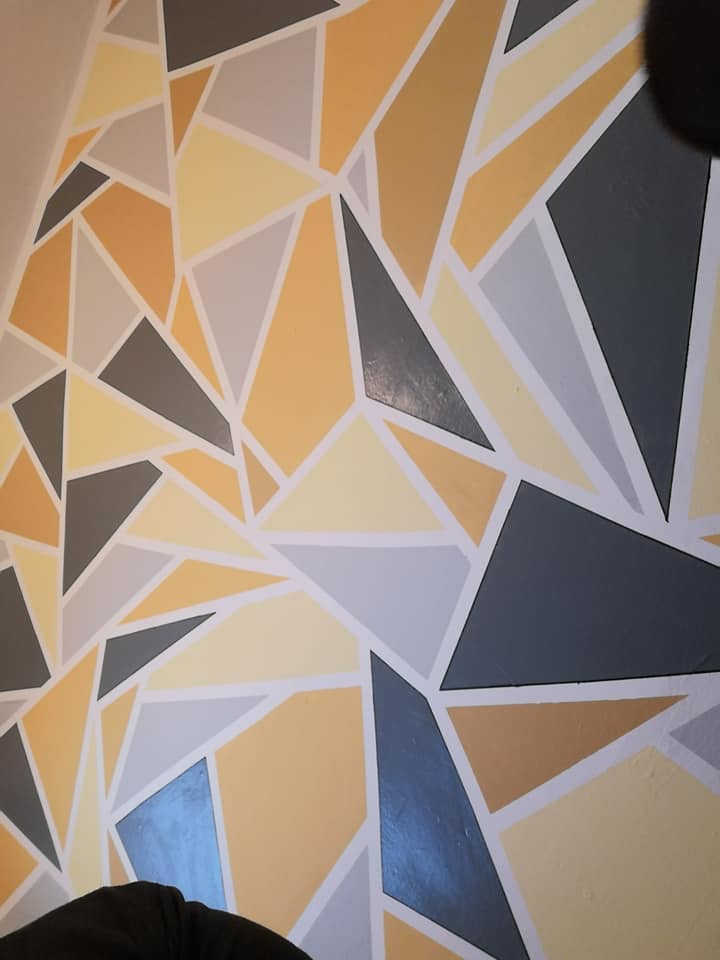 In the end, geometric shapes of different sizes and colors appeared on the wall. She also glued them with masking tape to make the edges look neat and even.