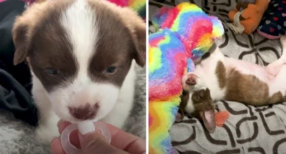 Bernard was checked and treated and off to a foster just like that! He cried all the way home, and it wasn’t until he met his milk bottle that he was fine. He even loved the pacifier as a sort of security blanket! Bernard then chose a big rainbow teddy bear as his cuddle buddy. π