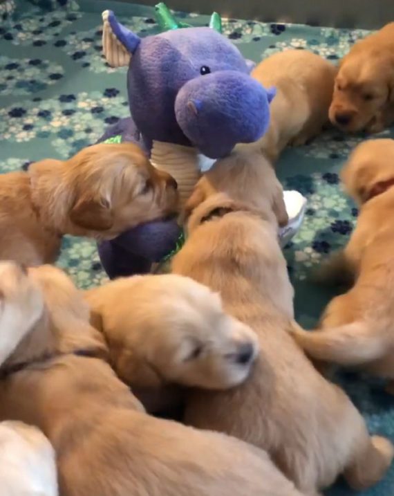 “Four week old Golden Retriever puppies from my litter experiencing story time with Dalton the Storytelling Dragon. The puppies were all mesmerized by Dalton and had a great experience with him,” the owner told ViralHog.