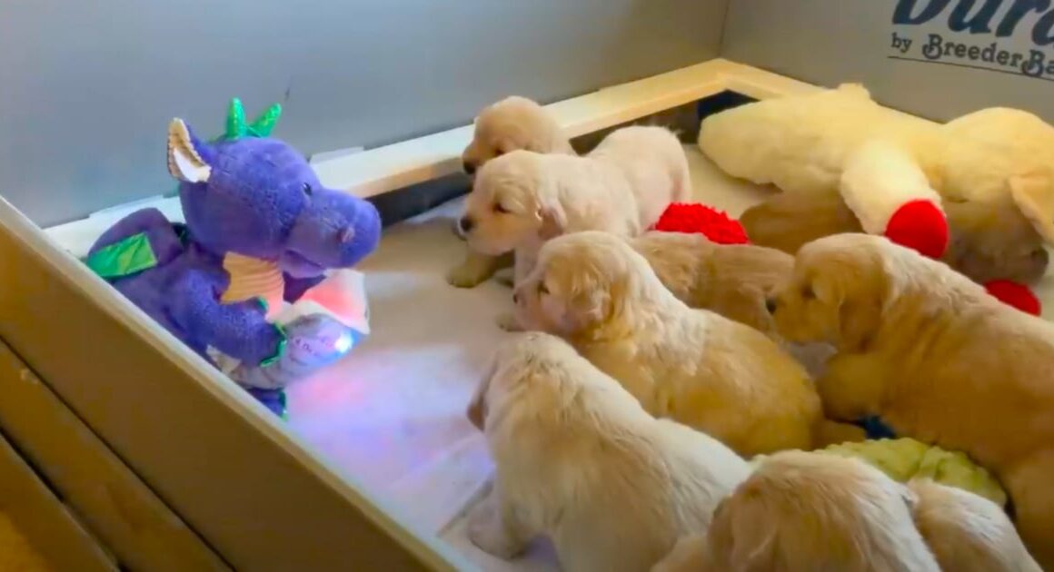 A Litter Of Golden Retriever Puppies Watch As Toy Dragon Reads Them A Story