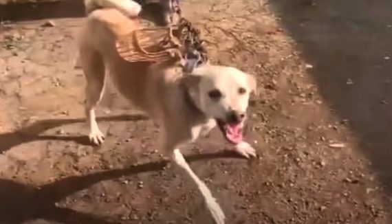 They found that inside of the room, the dog was also on the end of a mess of a chain. They freed him to see the sunshine for the first time in years, but he was still acting out. So their only choice was to safely secure him with a net for transfer.